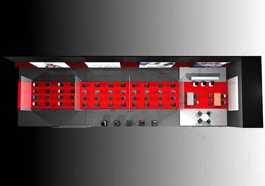 - Inszinierung der Stuhlexponate auf einem Laufsteg, kaschiert mit einem roten Teppich.
