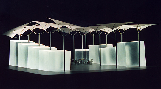 - Präsentationsschwerpunkt sind schwenkbare, überdimensionale Lichtsegel, die als Projektionsflächen für die verschiedenen Lichtquellen dienen.