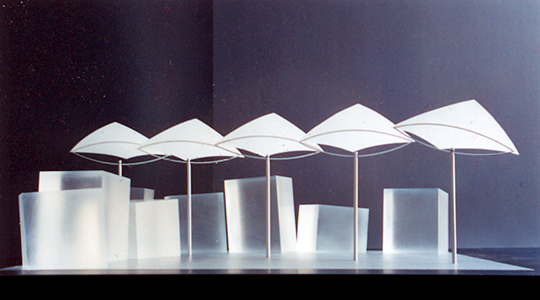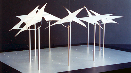 - Präsentationsschwerpunkt sind schwenkbare, überdimensionale Lichtsegel, die als Projektionsflächen für die verschiedenen Lichtquellen dienen.